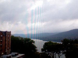 The built in camera in a macbook saves a mirror image, so left and right are reversed in this image taken from my fifth floor hotel room at the U.S. Military Academy’s Hotel Thayer. It really is quite the view though of the Hudson, looking southeast, about an hour’s drive from New York. The interesting interference pattern is caused by the insect screening in the window.