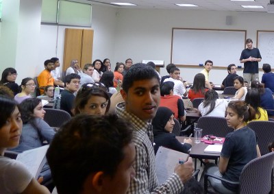 Yes, when it’s exam time, the Krasnow Institute lecture room fills up to the brim. The physics professor (at the back in the black T-shirt) is our very own Rob Cressman. The camera only caught half the room, the other half is equally as jammed. And that’s only half the class!