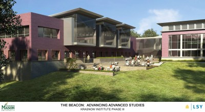 In this rendering, you can see the home of three of our research centers, facing across the terrace towards the existing Great Room (right of the image). Beyond the Great Room are the existing laboratories of the Institute along with core support facilities. The overarching goal here is to bring together theorists and experimentalists from disciplines spanning the Krasnow scientific program –mathematics, physics, computational sciences, neurobiology, cognitive psychology, experimental economics…and I could go on. But there is another crucial piece to the pie: the ability to embed Mason students directly into this rarified environment of advanced studies into the nature of cognition…students as scholars, indeed.