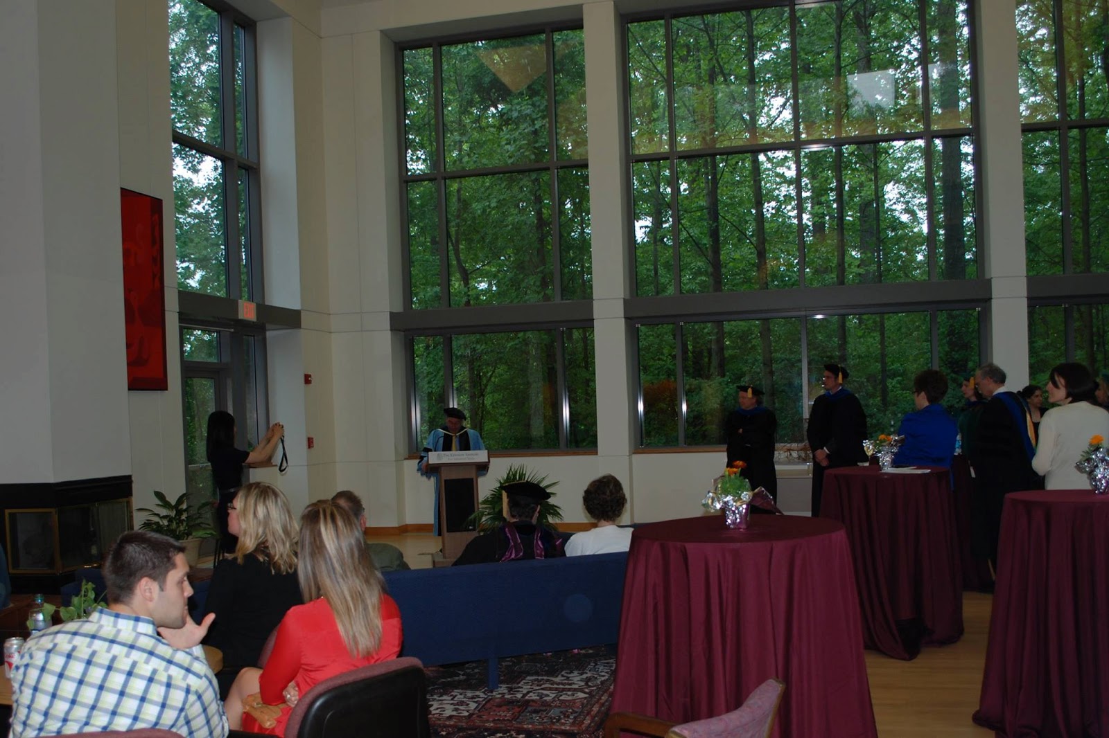 The setting is the Institute’s beautiful great room with its backdrop of modern art and tulip poplar trees…and yes, that’s me in the academic regalia behind the lectern.
