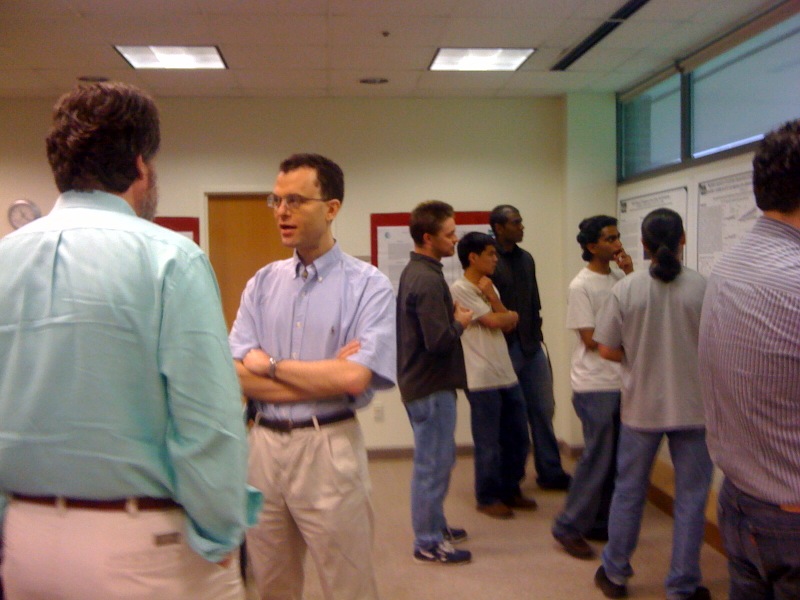 In the foreground here Giorgio Ascoli is engaged in a deep discussion about networks with Claudio Cioffi. Behind them doctoral students and Ted Dumas focus in on a poster.