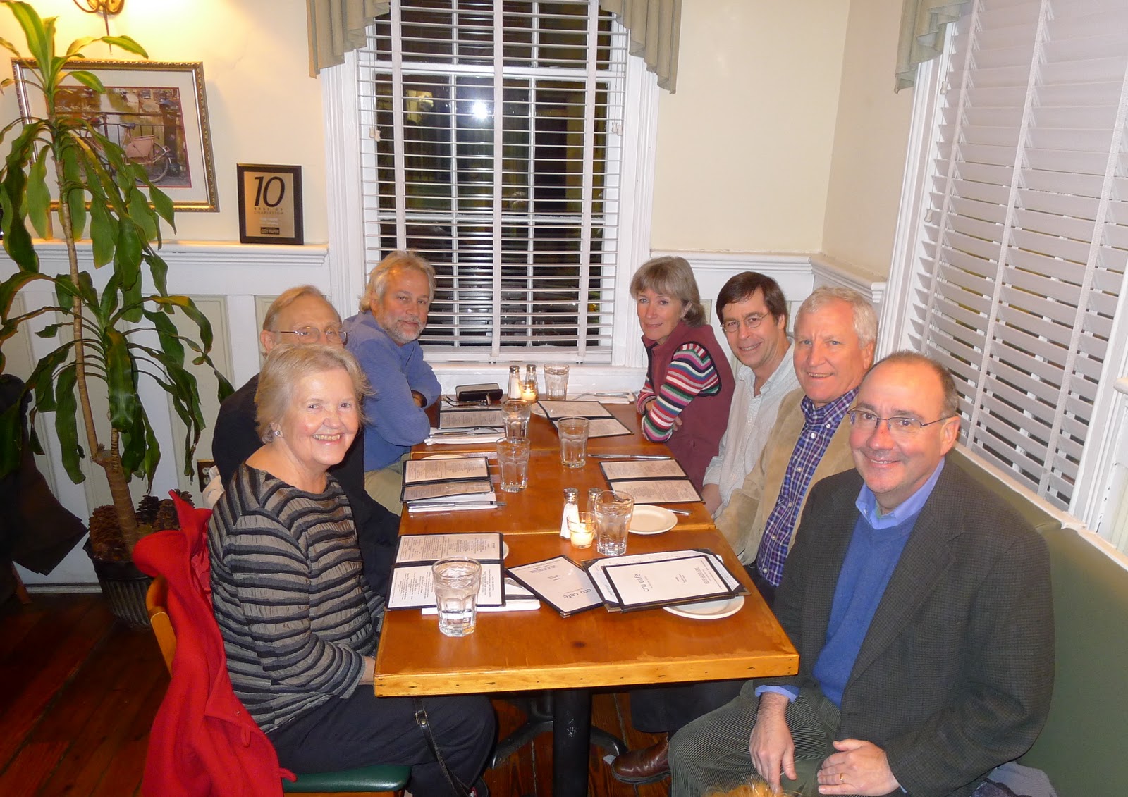 The annual Biological Bulletin Editorial Board dinner. Hosted by the Journal and SICB Secretary Lou Burnett. At the terrific Cru Cafe in balmy Charleston. Around the table from the left going counterclockwise: Managing editor Carol Schachinger, editor emeritus, Michael Greenberg, Charles Derby, Karen Burnett, Bill Kier, Lou Burnett and yours truly.